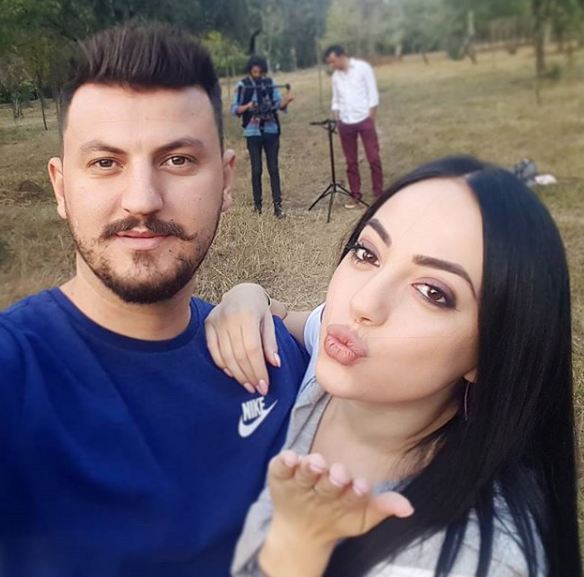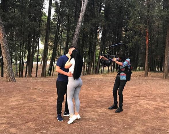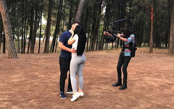Në krah të tyre duket kameramani, i cili është duke xhiruar skenën e puthjes në filmin ku dy artistët janë protagonistë.