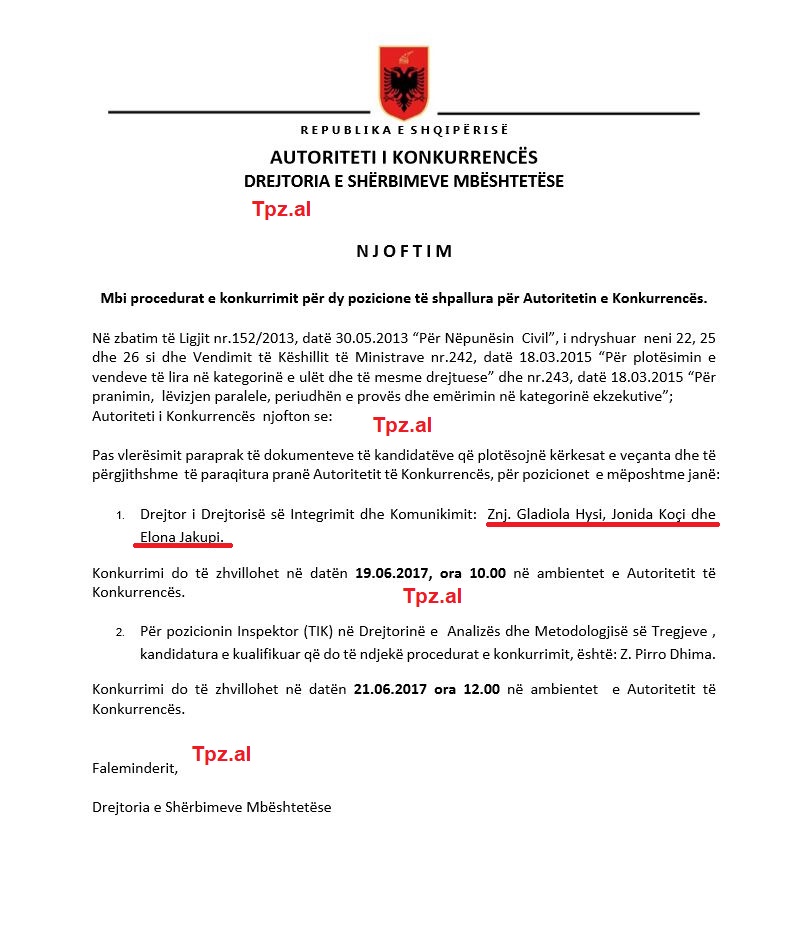 Në qershor të vitit 2017, Autoriteti i Konkurrencës shpall një pozicion vakant: Drejtor i Drejtorisë së Integrimit dhe Komunikimit. Aplikimi ishte online në faqen zyrtare të këtij institucioni, ndërsa çdo profesionist mund të garonte i lirë.