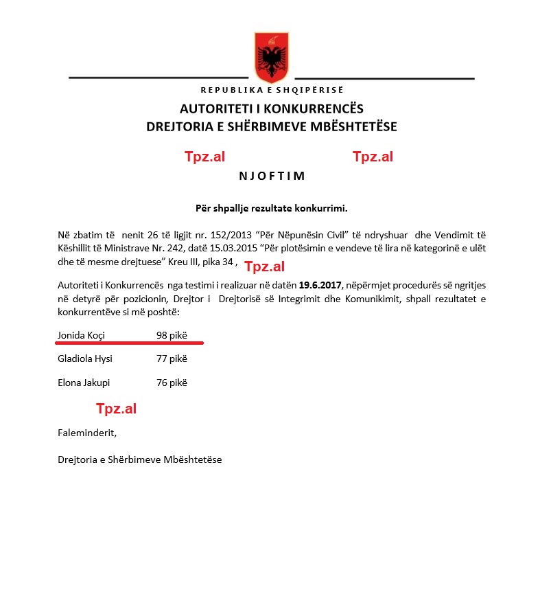 Por pyetja është kush fiton si Drejtore e Integrimit dhe Komunikimit, tek Autoriteti i Konkurrencës?! Natyrisht, Jonida Koçi, gruaja e kryetarit të AMF-së, dikur ish deputet i Partisë Socialiste. Sipas vendimit të datës 19.06.2017, e para renditet Jonida Koçi me 98 pikë, dhe më pas vijnë 2 punonjëset e AMF-së, Gladiola Hysi me 77 pikë dhe Elona Jakupi me 76 pikë.