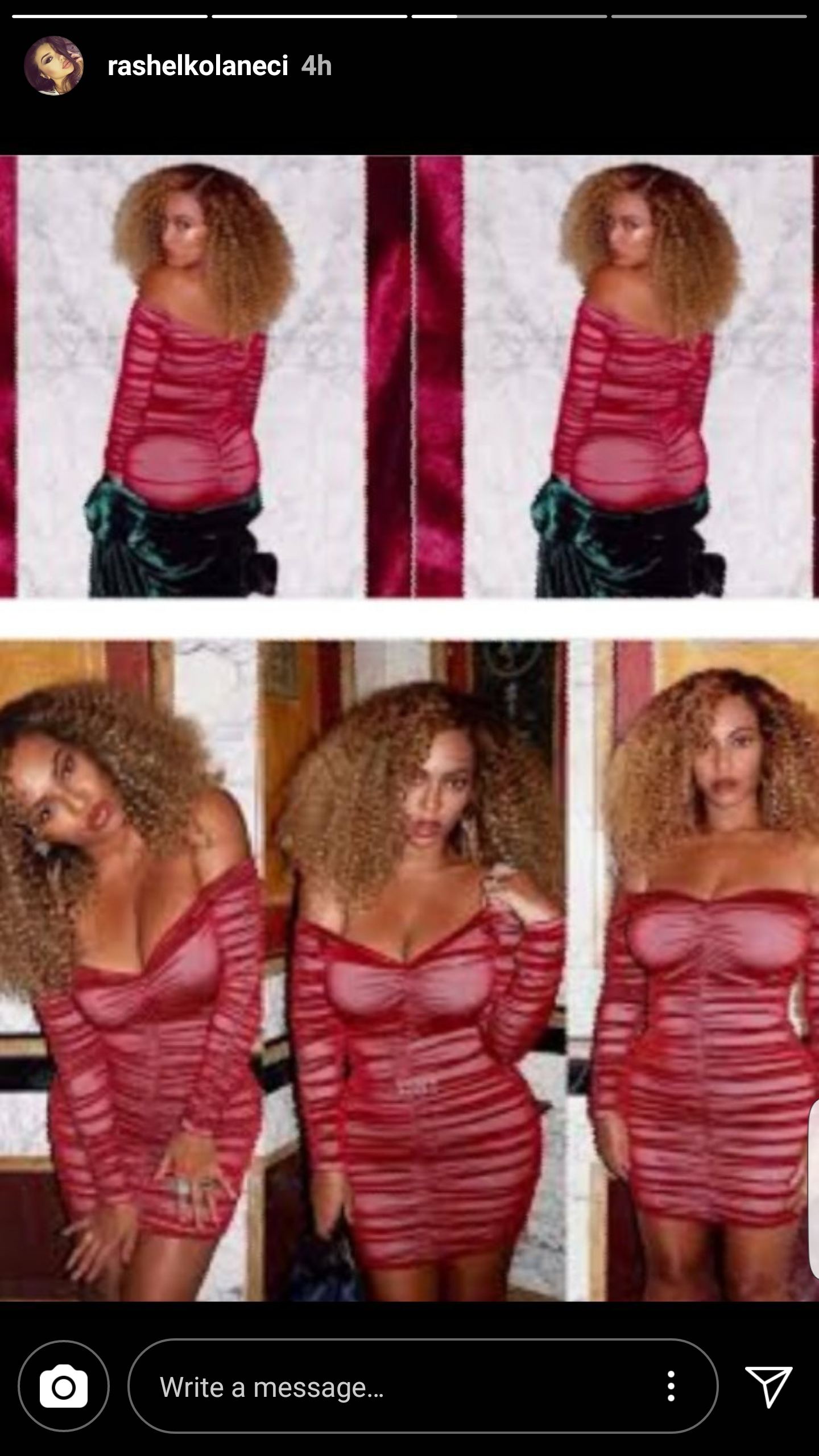 Ajo i ka pasuar postimet dhe më pas e ka krahasuar veshjen e saj me atë të Beyonce ku këngëtarja me famë botërore dukej e veshur me një fustan të ngjashëm me bodysuit-in e Rashelit, por në ngjyrë të kuqe.