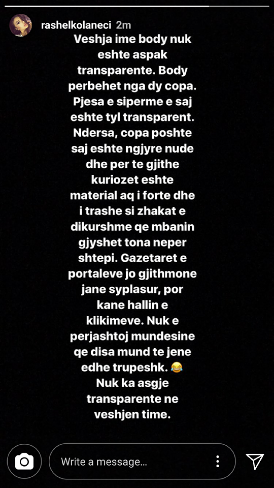 U përfol se ajo kishte veshur një kostum transparent ku i dukeshin komplet të pasmet, por Rasheli ka patur një reagim në profilin e saj në Instagram në lidhje me këtë.