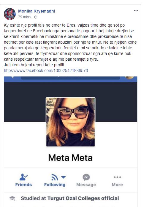 Ky eshte nje profil fals ne emer te Eres, vajzes time dhe qe sot po keqperdoret ne Facebook nga persona te paguar. I bej thirrje drejtorise se krimit kibernetik ne ministrine e brendshme dhe prokurorise te nise hetimet per kete rast flagrant abuzimi per nje te mitur. Ne te njejten kohe paralajmeroj ata qe keqperdorin femijet e mi se nuk do e kalojne lehte kete akt pervers, te frymezuar dhe sponsorizuar nga ata qe kurre nuk kane respektuar familjet e aq me pak femijet e tyre. Ju lutem bejeni report kete profil!"