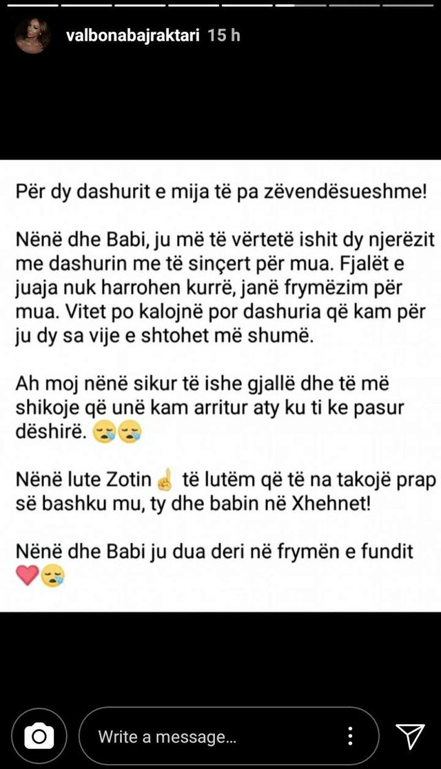 Në një postim në Instastory ajo u ka kushtuar një dedikim prekës prindërve të saj të cilët janë ndarë nga kjo jetë.