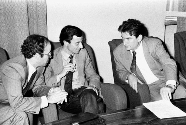 Tirane.03.05.91.-Nga e majta ne te djathte deputetet Fatos Nano, Genc Ruli dhe Sali Berisha duke biseduar.ATSH.Foto:Gani Xhengo