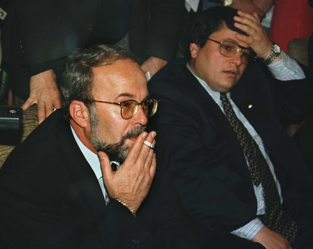 Tirane.07.06.91.-Aspekte nga caktimi i Ylli Bufit Kryetar i Keshillit te Ministrave.Nga e majta ne te djathte Ylli Bufi dhe Fatos Nano.ATSH.Foto:Gani Xhengo