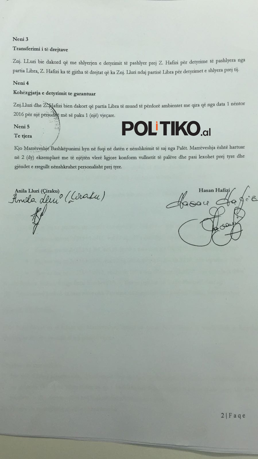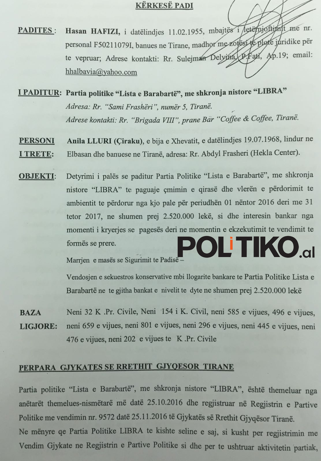 Politiko.al ka siguruar dokumentin e kërkesë-padisë së Hafizit, ku bie në sy fakti se kontrata nuk është nënshkruar mes tij dhe LIBRA-s, por ndërmjet biznesmenit Hafizi dhe pronarit të ndërtesës ku është strehuar partia politike për disa muaj.