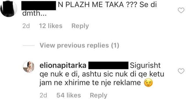 Aktorja shqiptare Eliona Pitarka e cila njihet nga publiku jo vetëm për rolin e saj në skenë, por edhe për fotot “e nxehta” dhe provokuese që publikon vazhdimisht, është përfshirë në një sherr të vogël në “Instagram” me një fans të saj, i cili e kritikon pse ka shkuar në plazh me taka.