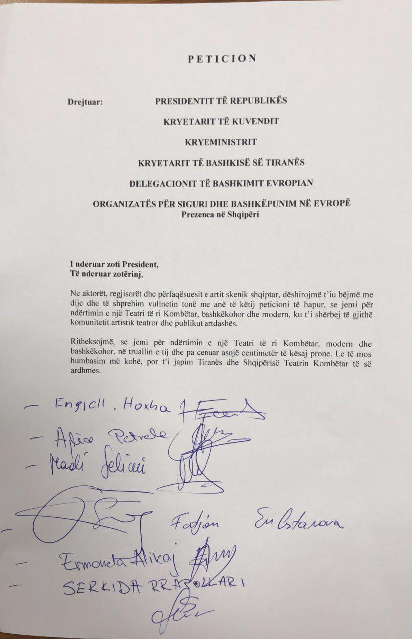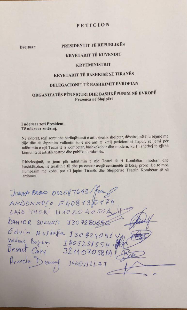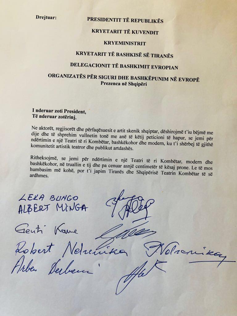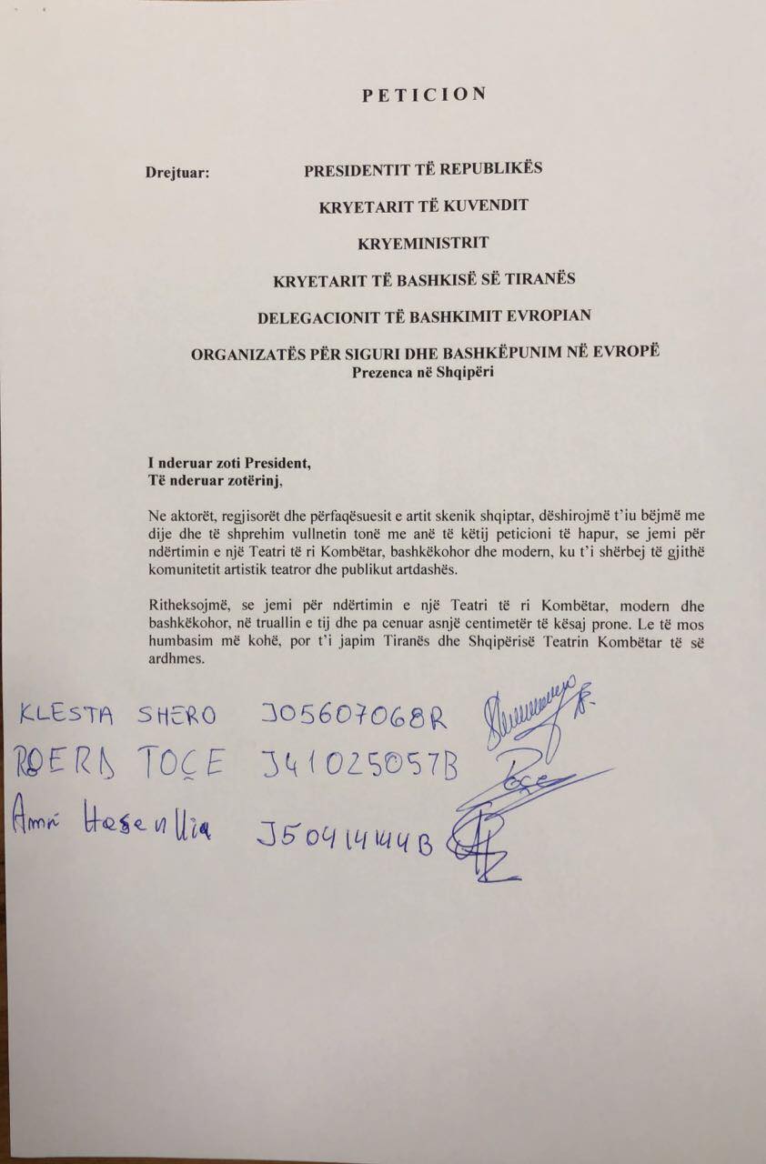 Ndërkohë që deri para disa ditësh shpresat i kishin varur tek mosdekretimi i Presidentit Meta për shembjen e Teatrit, sot një grup artistësh i kanë çuar Metës një peticion për ta dekretuar ligjin për një teatër të ri.