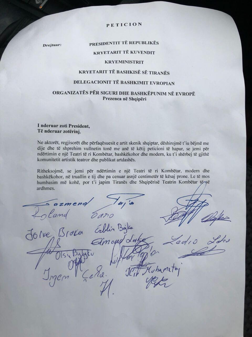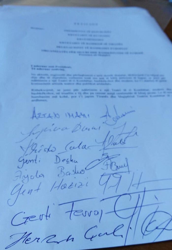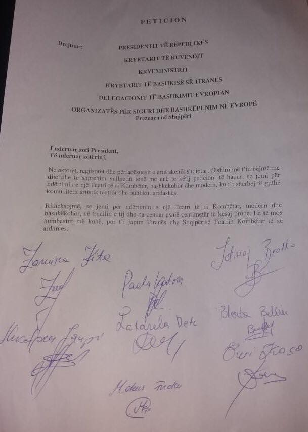 Pjesë e listës që ka firmosur peticionin janë: Robert Ndrenika Luftar Paja Alfred Trebicka Spiro Duni Leka Bungo Albert Minga Arben Derhemi Sotiraq Bratko Kliti Roshi Zamira Kita Artan Imami Genti Kame Genti Deçka Arjola Basha Gent Hazizi Gerti Ferraj Hervin Çuli Suela Konjari Laxarela Deti Mateus Frroku Paola Kodra Blerta Belliu Shkelqim Jaupi Guri Koço Klaudia Hila Nelson Mulla Erion Isai Violeta Trebicka Gazmend Paja Roland Saro Jorke Broka Erblin Bajko Olsi Bylyku Edmond Lako Ilir Muhametaj Ledio Lako Irgen Çela Klesta Shero Roerd Toçe Ami Hansellia Andon Koço Jonida Beqo Laid Ymeri Danier Shkurti Edvin Mustafa Valdano Bajrami Besart Cani Armela Demaj Engjell Hoxha Ajliçe Petrela Madi Selimi Fatjon Sulstarova Ermonela Alikaj Serkida Rrapollari
