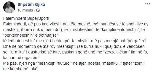 Faleminderit, që pas kaq vitesh, në këtë moshë, më mundësove të shoh live dy meshkuj, (burra nuk u them dot), të “mikloheshin”, “të komplimentoheshin”, të “përkëdheleshin”, e pothuajse të ledhatoheshin me njëri-tjetrin, për ta mbyllur me një hot “përqafim”. Dhe në momentin që ata “dy meshkuj” (se burra nuk i quaj dot) e vendosën se, “armiku” i dashurisë së tyre, paskam qenë unë me “zevzellëkun” tim në fb, kaluan në orgazëm. Më pas, njëri nga “meshkut” fluturoi” në ajër, ndërsa “mashkulli” tjetër “zbriti” me këmbë në tokë”.