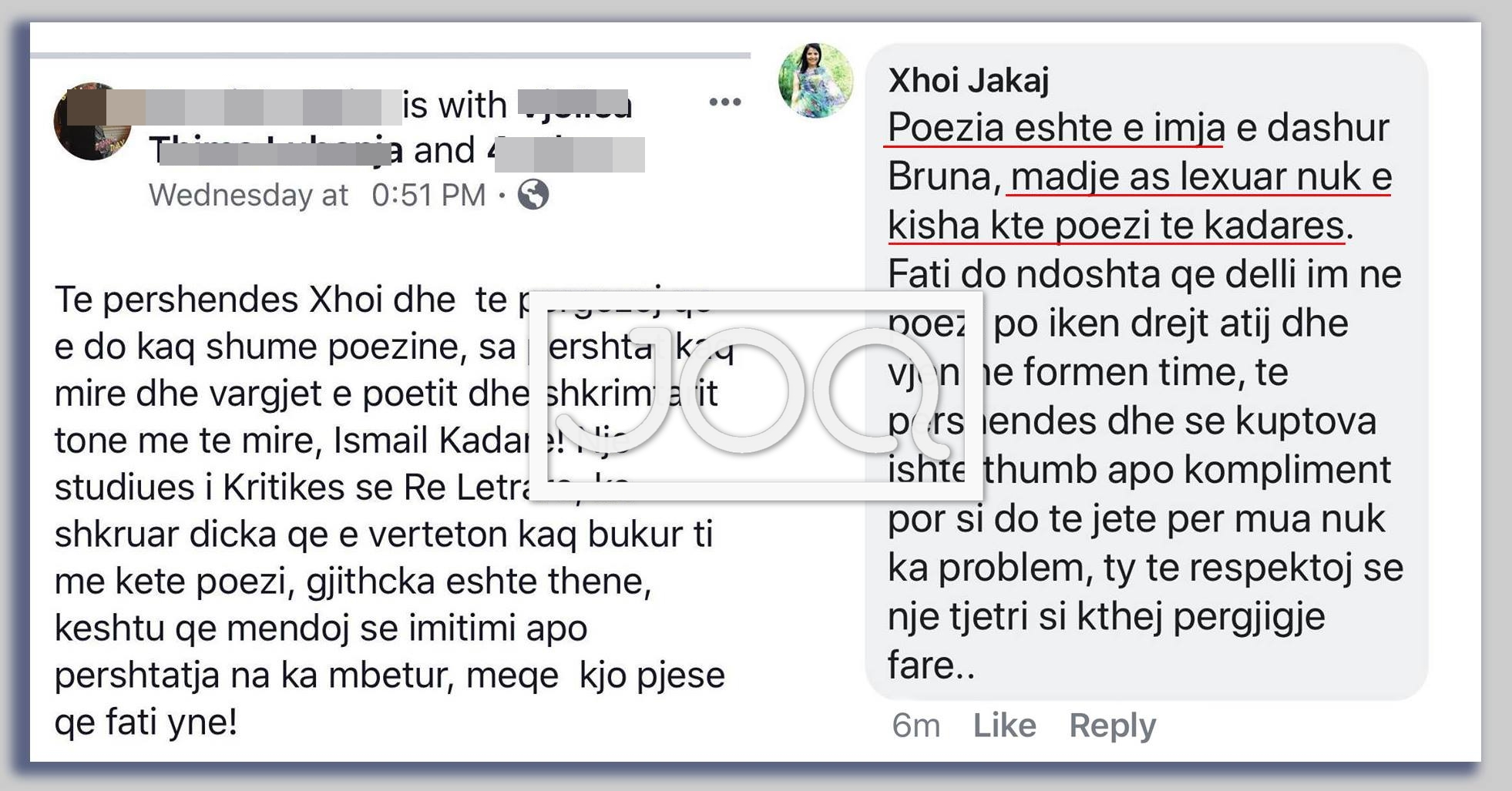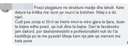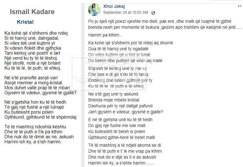 Mirëpo pak ditë më parë një postim i saji në facebook, ka irrituar ndjekësit që janë të shumtë. Xhoi kishte publikuar një poezi, që ngjasonte shumë me poezinë "Kristal" të Ismail Kadaresë. Ndjekësit e kanë akuzuar pedagogen e shkencave se poezia në fakt është plagjaturë, mirëpo ajo ka këmbëngulur se poezia është e veta. Madje thotë se as nuk e ka lexuar ndonjëherë poezinë e Kadaresë.