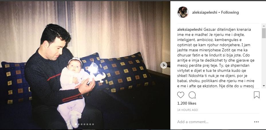 Gëzuar ditëindjen krenaria ime më e madhe! Je njeriu më i drejte, inteligjent, ambicioz, këmbëngulës e optimist që kam njohur ndonjëherë. I jam jashtë mase mirënjohese Zotit qe me ka dhuruar fatin e te lindurit si bija jote. Çdo arritje e imja te dedikohet ty dhe gjerave qe mesoj perdite prej teje. Ty, që shperndan virtytet e dijet e tua te shumta kudo qe shkel! Ndoshta ti nuk je ne dijeni, por je babai, shoku, politikani dhe njeriu me i mire e me i afte qe ekziston. Nje dite do u mesoj femijeve te mi gjthçka më ke mësuar ti mua, sepse prej teje duhet të marrë shembull çdo individ, në menyrë që, siç të thashë edhe vjet, bota të bëhet një vend më i mirë. Të uroj edhe 100 vite të lumtura. Ti i meriton me shumë se kushdo. Te dua shumë, ba!"