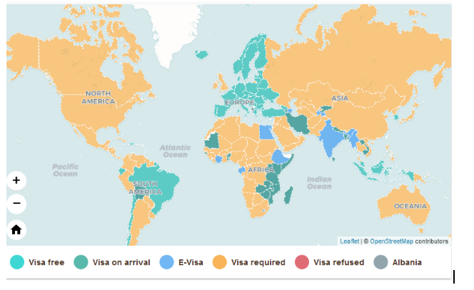 Shtetasit me një pasaportë shqiptare mund të vizitojnë 193 vende me vizë të ndryshme. Portali Visalist.io ka listuar së fundmi të gjithë shtetet që mund të vizitojnë shtetas të ndryshëm nëpër botë, sipas kategorizimit sipas vizës që u nevojitet të marrin. Një pjesë e shtetasve kanë lehtësinë e përfitimit të një vizë elektronike, ashtu sikurse shumë shtete ‘shquhen’ për pasaportën e tyre të fortë, që nënkupton lëvizje e lirë në një numër të madh shtetesh.