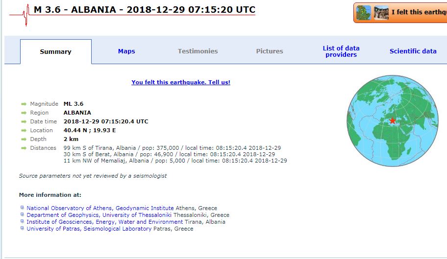 Epiqendra e tërmetit të rënë sot në orën 08:15 ka qenë 11 larg Memaliaj, por është ndjerë shumë edhe në Berat, e më pak në Tiranë.