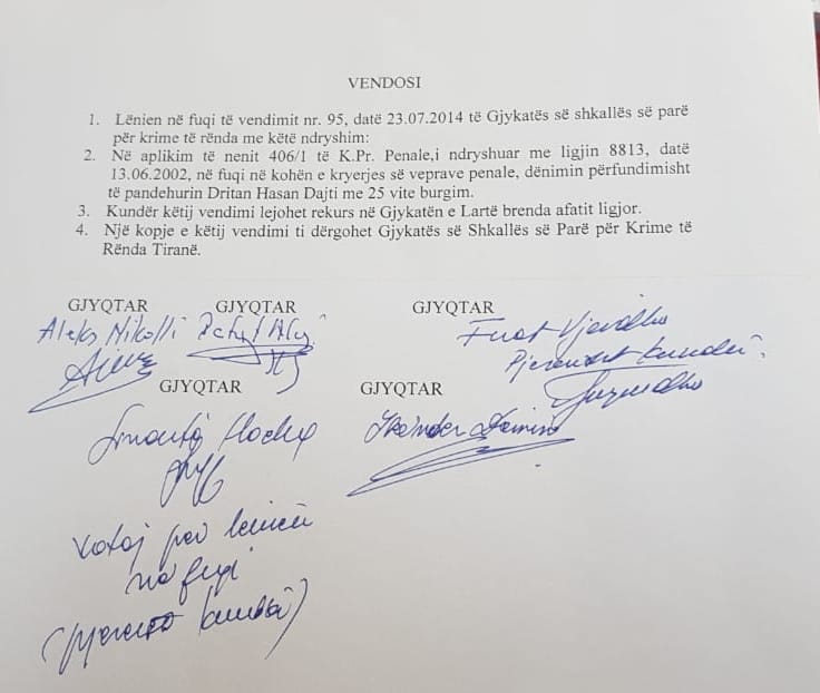 Në këtë dokument që gjyqëtari, Fuat Vjerdha ka publikuar dallohet se ai ka firmosur pjesërisht kundër uljes së dënimit.
