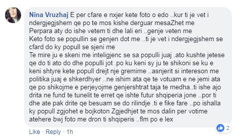 Te mire ju e skeni me inteligjenc se sa populli juaj .ato kushte jetese qe do ti ato do dhe populli jot .po ku keni sy ju te shikoni se ku e keni shtyre kete popull drejt nje gremime ..asnjerit si intereson me politika juaj e shkerdhyer ..ne ishim ata qe te votuam e ne jemi ata qe po shikojme e perjeyojme genjershtrat taja te medha..ti ishe ajo drita ne fund te tunelit te erret qe ishte futur shqiperia jone ..por ti dhe ate pak drite qe besuam se do rilindje .ti e fike fare ..po ishalla ky popull zgjohet e bojkoton Zgjedhjet te mos dalin per votime atehere bwj foto me dron ti shqiperis ..flm po e lex."