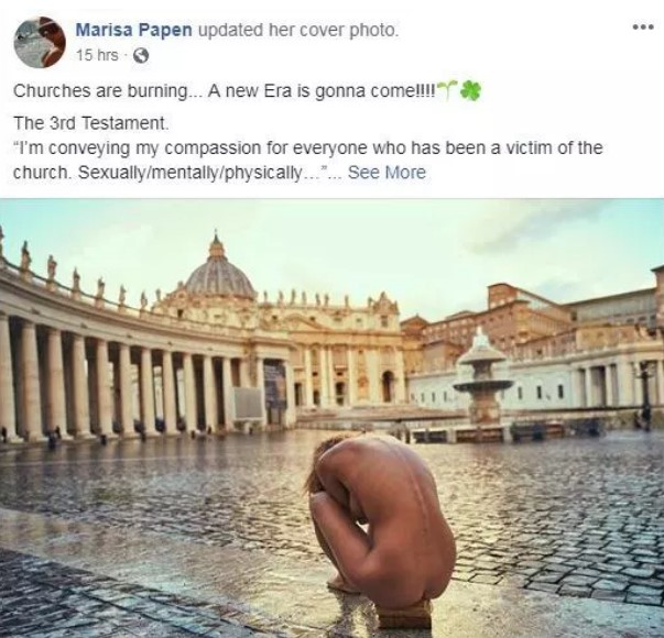 Bëhet fjalë për modelen Marisa Papen, e njohur për pozat nudo në vende të ndryshme. Ajo shkruajti në rrjete sociale se ishte e lumtur që po digjej Katedralja 850-vjecare.