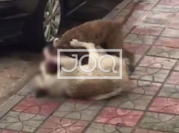Në redaksinë e JOQ Albania, kanë ardhur disa pamje, ku shihet sesi një pitbull sulmon një qen rrugës. Pitbulli e ka kafshuar qenin në qafë dhe nuk e lëshon. Madje e tërheq zvarrë dhe e fut poshtë rrotave të një makine.