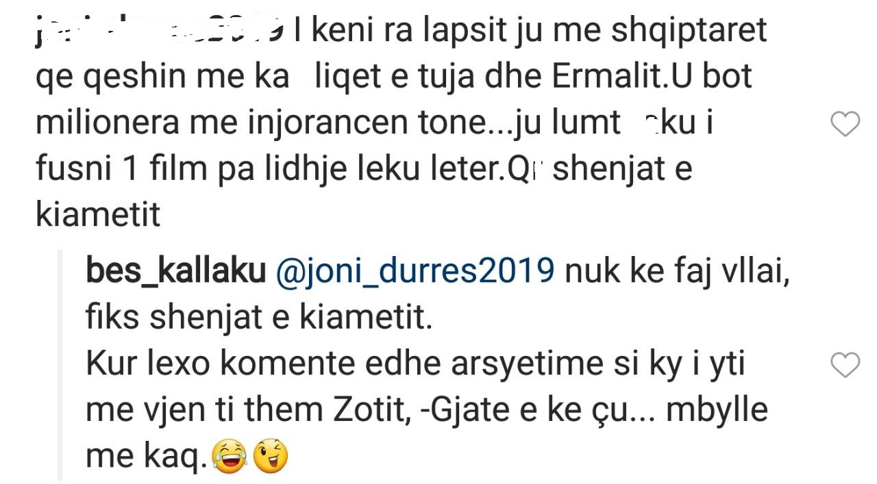 Një prej ndjekësve të aktorit, Bes Kallaku i ka komentuar atij kështu: