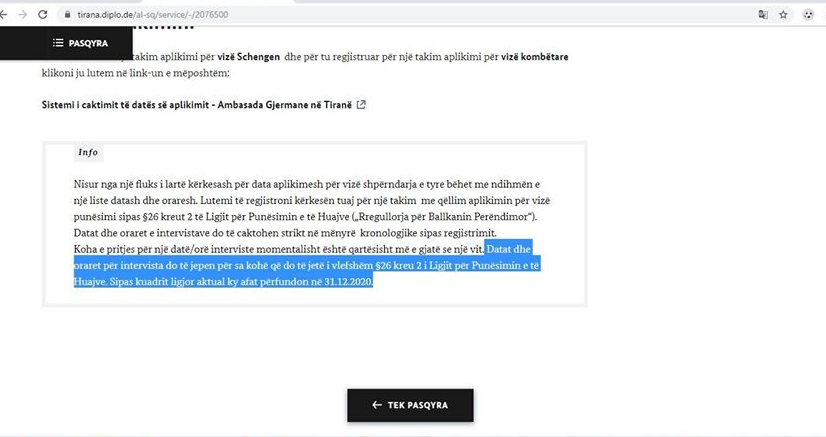 Qytetari i bën thirrje ambasadës gjermane të ndalojë rezervimin e takimeve për kategorinë e vizave sipas nenit 26 të Kapitullit 2 të Ligjit për Punësimin e të Huajve në Gjermani, e cila është kategoria më e kërkuar nga shqiptarët.