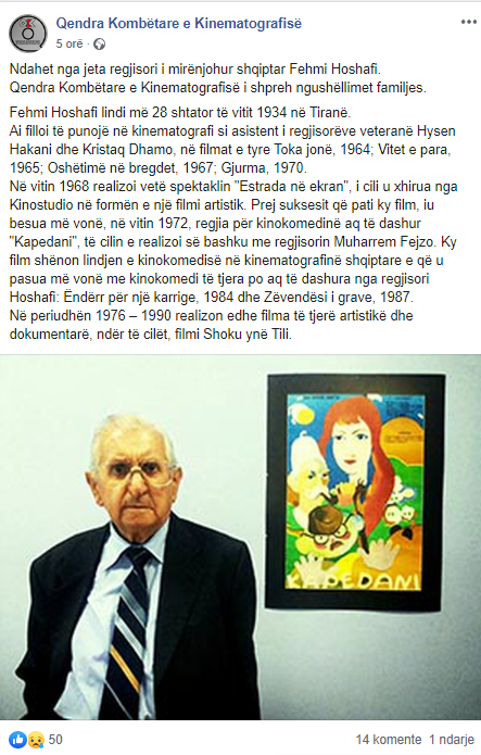 Lajmi i trishtë është bërë i ditur nga "Qendra Kombëtare e Kinematografisë", duke shprehur edhe ngushëllime familjarëve të regjizorit të ndjerë.