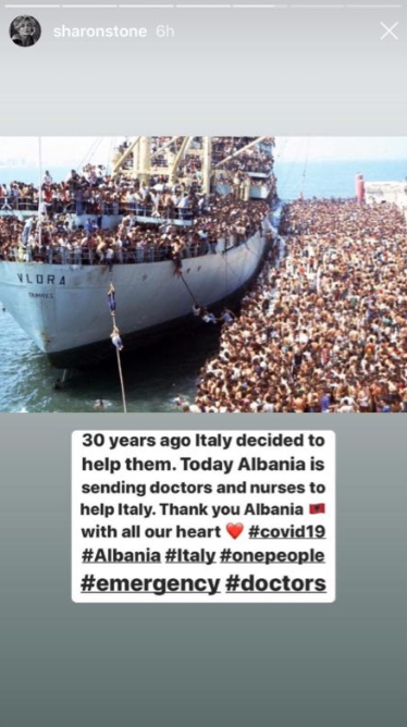 Në lidhje me gjestin e Shqipërisë ndaj Italisë ka reaguar edhe aktorja e famshme hollivudiane, Sharon Stone, e cila përmes një story të publikuar në llogarinë e saj në Instagram, ka falenderuar nga zemra vendin tonë.