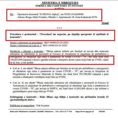 Sipas asaj që raporton “Boldnews.al”, tenderi është i përbërë në dy lote; pjesa më e madhe e fondit, rreth 1.05 miliardë lekë janë destinuar për blerje ushqimesh dhe pjesa tjetër për materiale mbrojtëse për ushtarakët që janë angazhuar në parandalimin e Cov-19.