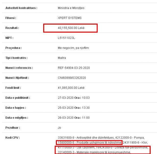 Pra, konstatohet lehtësisht se “Xpert System”, në aktivitetin e saj, nuk ofron asnjë shërbim për dizinfektues, produkte ushqimore, klor, ujë të pijshëm, doreza njëpërdorimëshe apo materiale mjekësore të konsumueshme, të gjitha këto mallra që kërkoheshin nga Ministria e Mbrojtjes në tenderin pa garë, me vlerë 500 mijë euro.