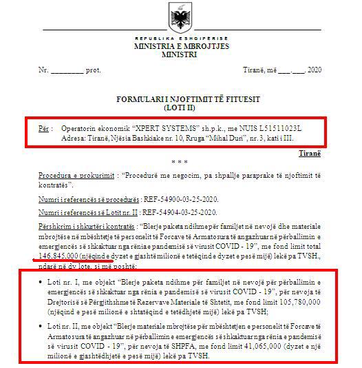 Kompania “Xpert System” është shpallur fituese e një tenderi pa garë, për “Blerje materiale mbrojtëse për mbështetjen e personelit të Forcave të Armatosura të angazhuar në përballimin e emergjencës së shkaktuar nga rënia e pandemisë së virusit COVID – 19”.