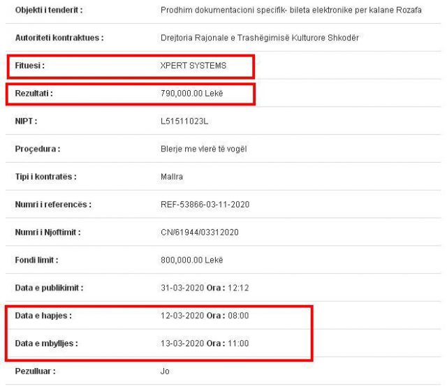 Kalatë dhe muzetë përfshiheshin në këto kufizime, si vende që mbledhin shumë qytetarë. Por, pikërisht, në ato ditë, Drejtoria Rajonale e Kulturës Shkodër vendos të zhvillojë tenderin e biletave, në të cilën shpallet fitues “Xpert System”.