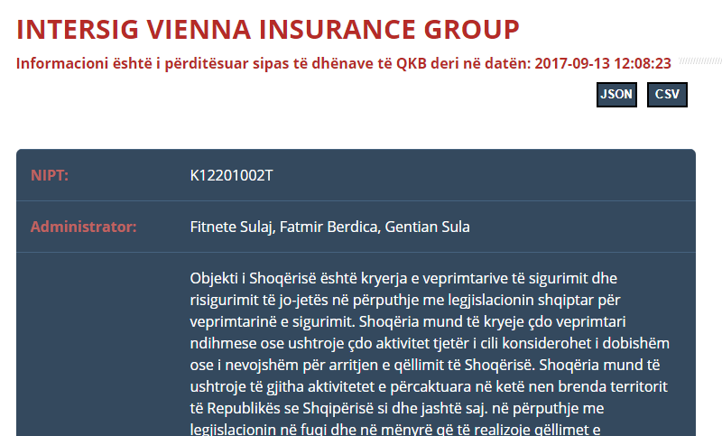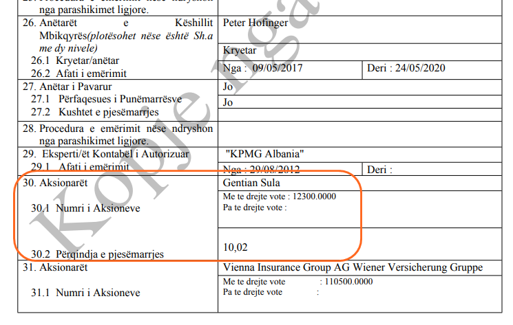 Kompania në fjalë rezulton se ka 3 administratorë, përkatësisht Fitnete Sulaj, Fatmir Berdica, Gentian Sula, ku ky i fundit është edhe pronari i vetëm shqiptar me 10% të aksioneve, pasi 90% i zotëron kompania mëmë nga e cila ka marë edhe emrin, Vienna Insurance Group AG Wiener Versicherung Gruppe. Kjo shoqëri ka fituar në vitet e fundit rreth 650 milionë lekë të vjetra nga tenderat.