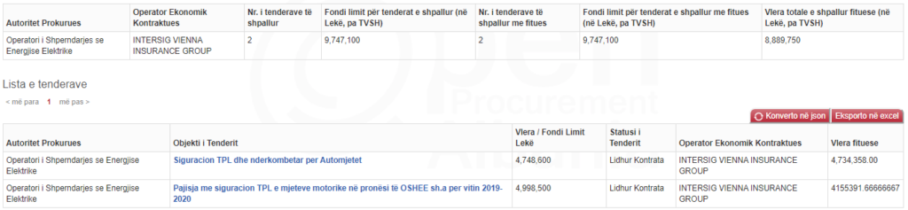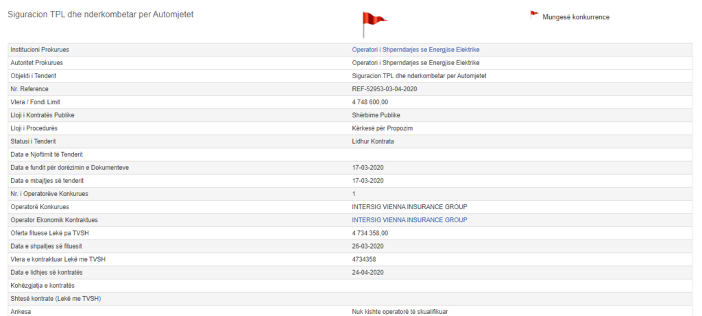 Kështu OSHEE i ka dhënë kompanisë INTERSIG VIENNA INSURANCE GROUP dy tendera për siguracione makinash në vlerë totale rreth 100 milionë lekë të vjetra. Të paktën njëri prej tyre, ai me referencë REF-52953-03-04-2020, është cilësuar si i shënuar me flamur të kuq nga Open Procurement Albania.