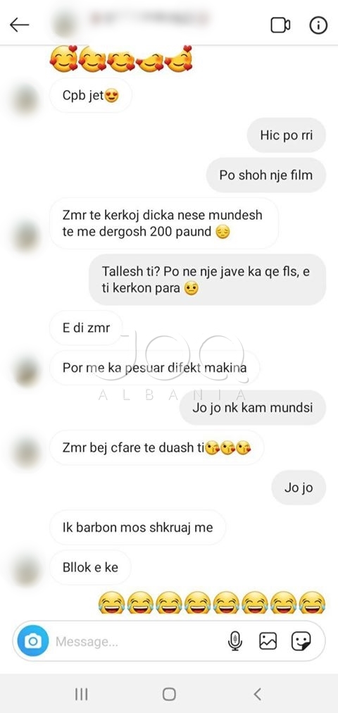 Një i ri, i cili jeton në Angli ka dërguar mesazhet ku ka folur me një vajzë në Shqipëri. Vetëm me një javë bisedë, e reja i ka kërkuar 200 Paund, pasi sipas saj i ishte prishur makina. Djali nuk ka pranuar t’ia japë dhe pas kësaj ajo e ka ofenduar duke i thënë barbon dhe duke i bërë bllok.