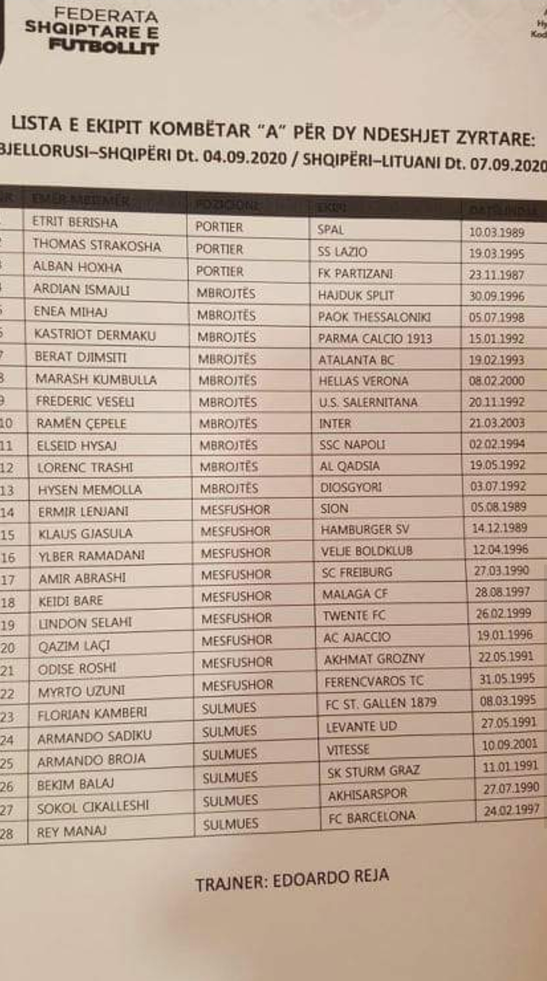 Trajneri i kombëtares shqiptare, Edi Reja shpall sot listën me futbollistët e ftuar për 2 sfidat e radhës, të vlefshme vlefshme për Ligën e Kombeve, ndaj Bjellorusisë në (4 shtator) në Minsk dhe ndaj Lituanisë në (7 shtator) në Tiranë.