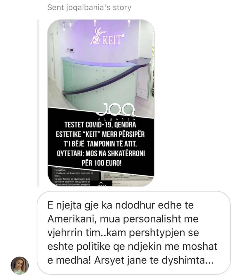 Mbrëmjen e djeshme publikuam një rast abuzimi me testet Covid nga qendra estetike “KEIT”, i cila kishte marrë përsipër t’i bënte tamponin një të moshuari, edhe pse kjo gjë del jashtë profilit të tyre. Por arsyeja e gjithë kësaj ishte 100 euroshi që qendra kërkonte në këmbim për të bërë testin. Rasti u denoncua nga një qytetar, i biri i të moshuarit, ku ndër të tjera tha se shërbimi nuk ishte aspak serioz, pasi në përfundim pas tre ditësh, ndryshe nga sa i kishte thënë stafi i klinikës se përgjigjja e tamponit do të dilte për një ditë, rezultati ishte: I dyshuar! Pra një përgjigje që s'të thotë asgjë. Ndërkohë në një mesazh tjetër të mbërritur në redaksinë tonë, një qytetare shkruan se e njëjta gjë i ka ndodhur edhe asaj me vjehrrin e vet te Spitali Amerikan, i cili është në pronësi të Klodjan Allajbeu. Arsyet sipas saj janë të dyshimta, pasi kështu ndodh në përgjithësi me moshat e treta.