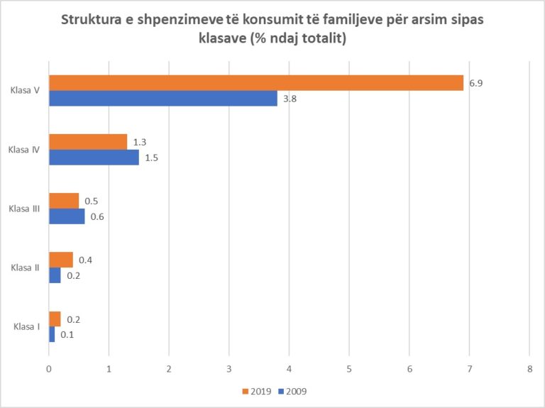 Familjet më të varfra në vitin 2009 i dedikuan vetëm 0.1% të buxhetit të tyre mujor shërbimeve arsimore, ndërsa në vitin 2019 ky tregues ishte 0.2%
