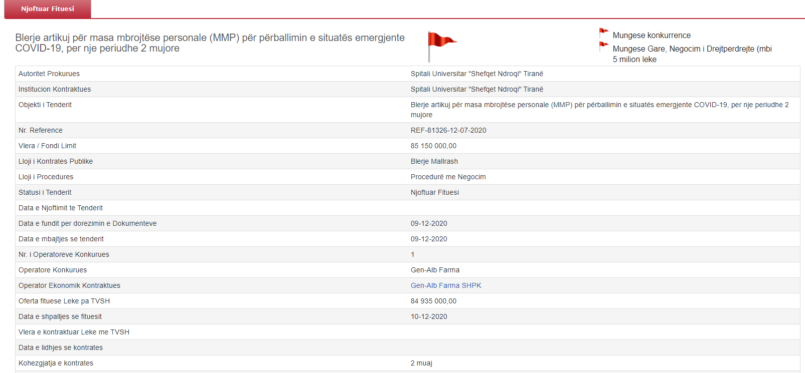 Teksa protestat për Drejtësi për vrasjen e paprecedentë të Klodian Rashës vlonin në kryeqytet dhe qytetet e tjera të vendit, institucionet e Shëndetësisë shpallën fituesit e dy tenderave shumë-milionësh. Në datën 10 Dhjetor, QSUT dhe Shefqet Ndroqi kanë shpallur dy kompani fituese për tenderat me objekt furnizimin me maska mbrojtëse personale për përballimin situatës së Covid-19 për 2 muaj. Të dyja procedurat e tenderimit janë në shkelje totale me ligjin e prokurimeve publike, pasi janë shënuar me FLAMUR TË KUQ për Mungesë Konkurrence dhe Mungesë Gare, Negocim i Drejtpërdrejtë (Për procedura mbi 5 Milion Lekë).