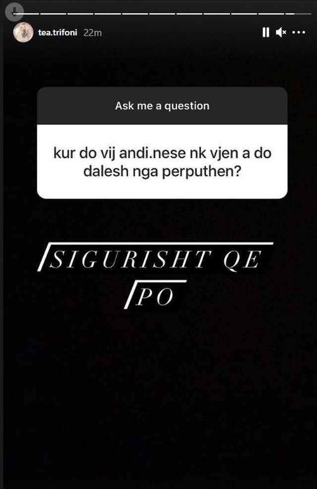 Ndërkohë pas kësaj lind pyetja nëse Tea do të qendrojë më në program. Përmes një Instastory, tea ka deklaruar se do të largohet nëse Andi nuk kthehet.