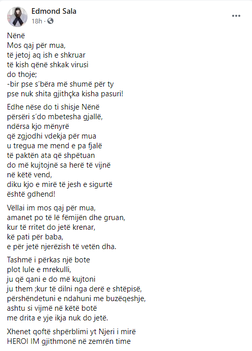Sëfundmi, vëllai i Arjanit ka postuar një poezi prekëse për të vëllain, përmes së cilës imagjionon fjalët e fundit të tij.