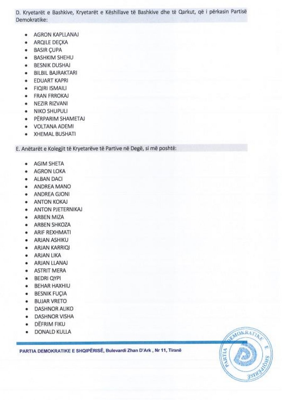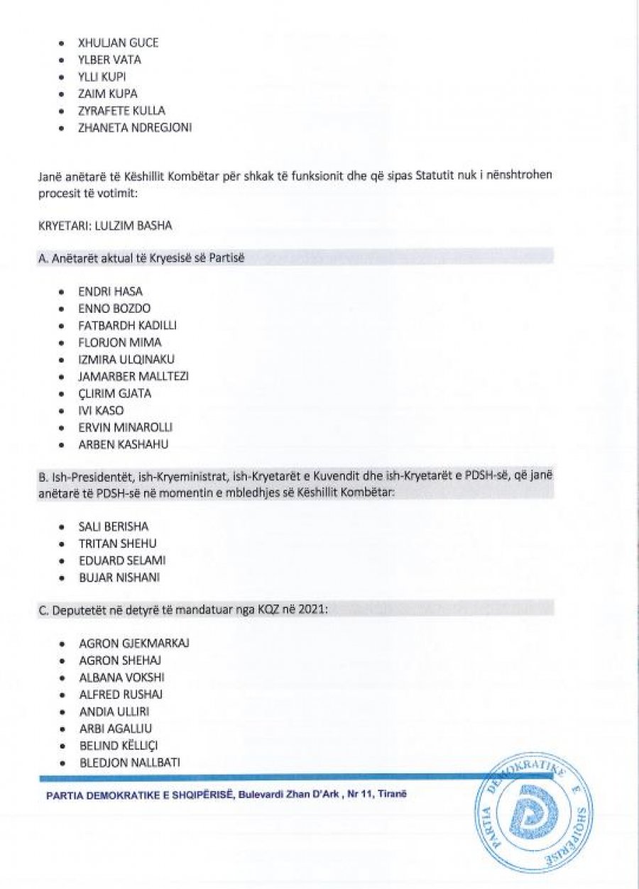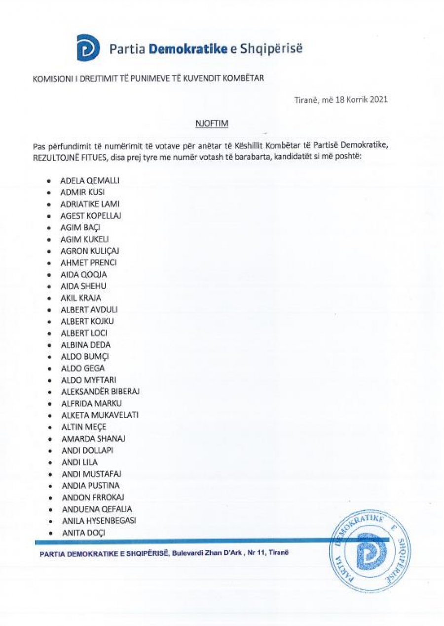 Ditën e djeshme Kuvendi Kombëtar i Partisë Demokratike votoi për anëtarët e rinj të Këshillit.Mesditën e sotme Partia Demokratike ka shpallur listën fituese të anëtarëve të Këshillit Kombëtar. PD ka bërë të ditur emrat e 300 anëtarëve, të cilët do të jenë në Këshillin Kombëtar për 4 vitet e ardhshme. Vihet re se në listë nuk është shpallur fituese Edit Harxhi, e cila ishte një prej kandidateve për kryetare të PD, dhe Arben Ristani, ish-Sekretar i Përgjithshëm i PD-së. Nga ana tjetër në listë nuk mungojnë emra të njohur si Aldo Bumçi, Agim Baçi, Andi Lila, Asllan Dogjani, Jemin Gjana, Glauk Olldashi, Ahmet Prençi.