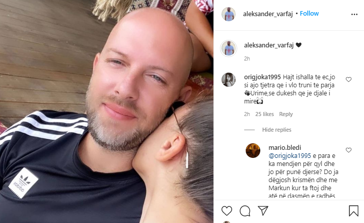 Ish- bashkëshorti i aktores Rudina Dembacaj, Aleksandër Varfaj duket se ka vendosur të lërë pas dhe të harrojë gjithçka që kaloi me aktoren e humorit, pasi ka ka nisur një lidhje të re dashurie. Aleksi u nda dy vjet më parë me Rudina Dembacajn, ku kjo e fundit u lidh me ish-deputetin Mark Frroku. Ka qenë vetë Aleksi, i cili ditën e sotme ka bërë publik lajmin se ka filluar një romancë të re dhe se ndihet më i lumtur si kurrë më parë. Në foto ai shihet bashkë me një vajzë, identiteti i të cilës nuk bëhet i ditur, ndërsa kjo e fundit i jep një puthje në qafë. Nga ana tjetër Rudina ka treguar shpesh se ruan një marrëdhënie të mirë me ish- burrin, me të cilin ka edhe një vajzë. Aleksi ka marrë shumë komente dhe urime nga ndjekësit e tij në Instagram. “Hajt ishalla te ec, jo si ajo tjetra qe i vlo truni te parja. Urime, se dukesh qe je djale i mire”- është një prej komenteve në postimin e tij.
