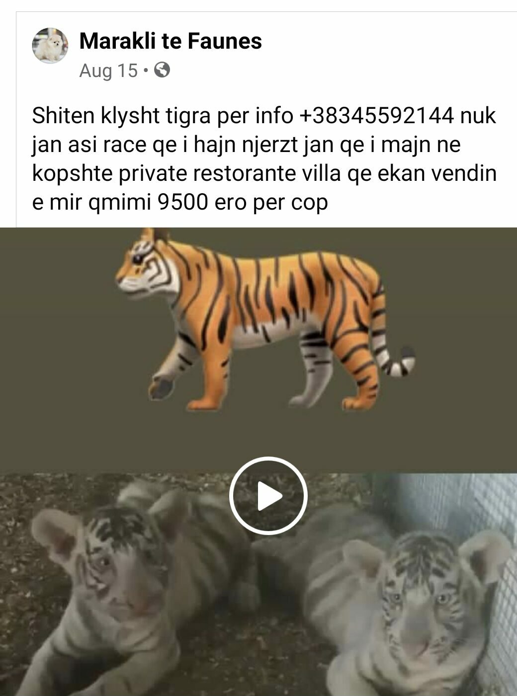 “Shiten këlyshët tigra. Nuk janë racë që i hanë njerëzit, janë që mbahen në kopshte private, që e kanë vendin e mirë. Çmimi 9,500 euro për copë”, ka shkruar qytetari.