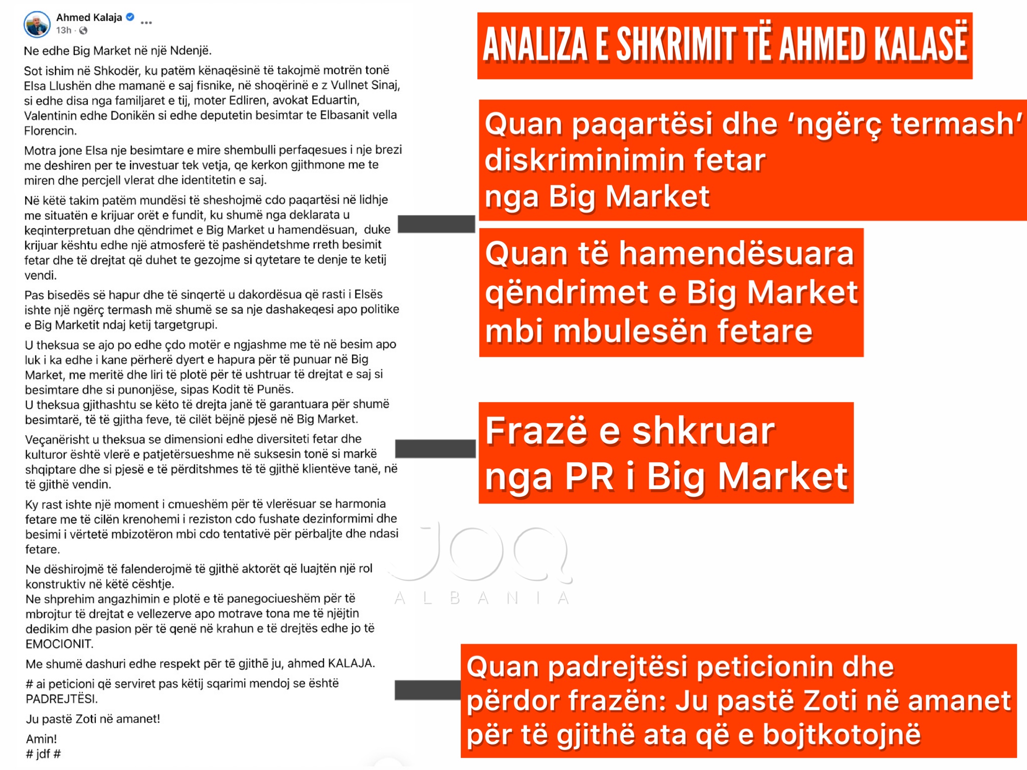 Pasi historia e Elsës u bë fillimisht publike nga disa faqe të vogla që predikojnë besimin islam, dhe historia u denoncua në JOQ ku u trumpetua diskriminimi i vazhdueshëm nga Big Market i besimtarëve myslimanë, në mënyrë të papritur Kalaja hyn në lojë dhe e shet veten si shpëtimtar. Dje takoi presidentin e këtij marketi dhe sot ulët në tavolinë në shtëpinë e Elsës në Shkodër me pronarin Vullnet Sinaj dhe deputetin e PS për qarkun e Elbasanit.