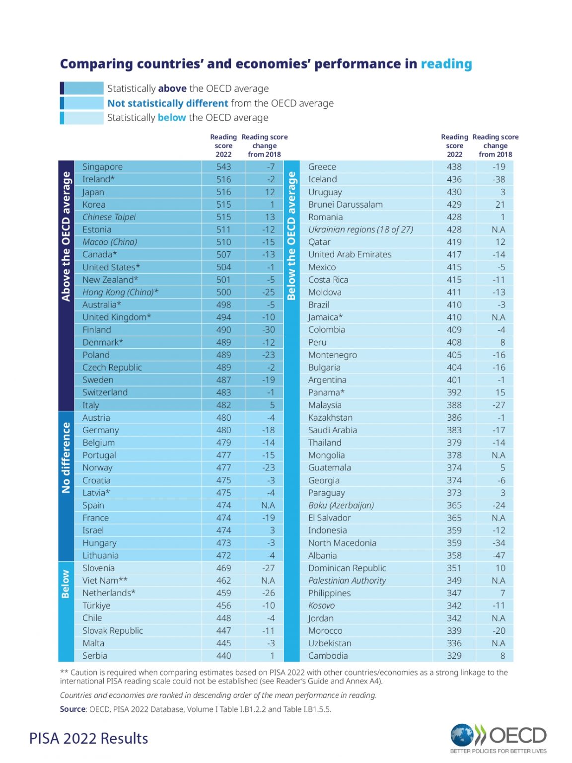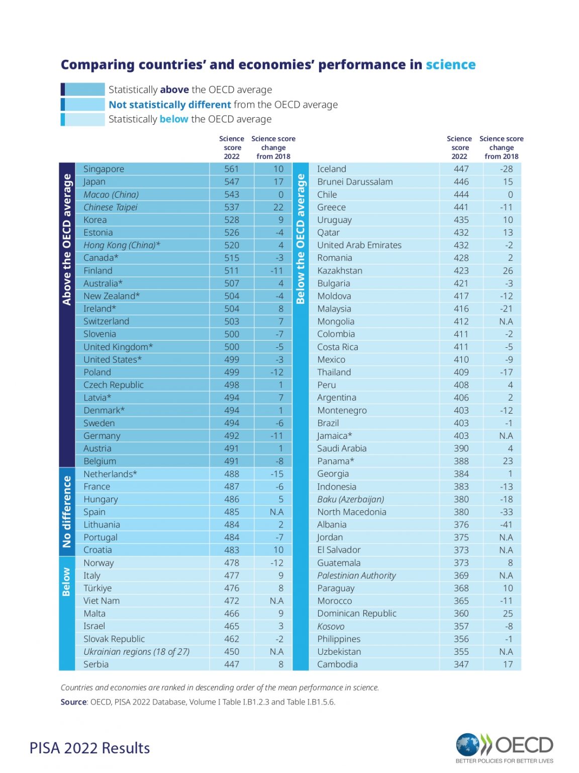 Ndryshe nga vendet Kosova e cila shënon një pozicion të ngjashëm, duke zënë vendin e 78-të, me një rënie prej 11 pikë nga viti 2018. Për lëndët specifike, ajo renditet në vendin e 76-të për lexim, 77-të për shkencë dhe 74-të për matematikë.