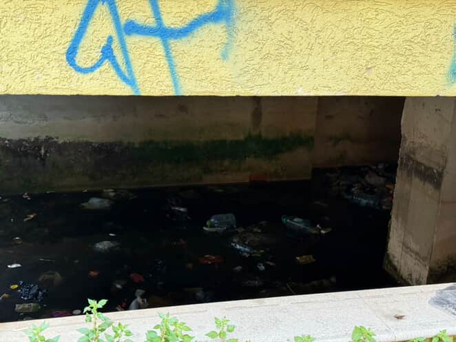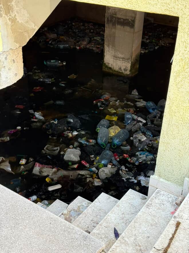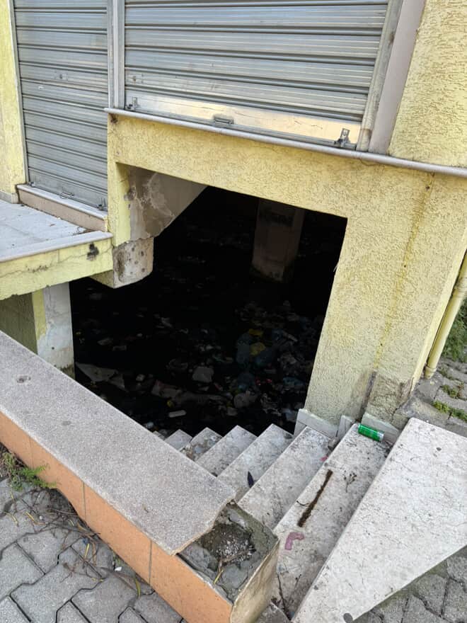 Në foto shihen dhjetëra bidona plastike, kanaçe, qese mbeturinash dhe mbeturina të tjera të lundrojnë në ujë të zi dhe të ndotur, i cili ka mbuluar shkallët dhe hapësirat poshtë pallatit. Dëmtime në mure dhe shtylla mbajtëse gjithashtu janë të dukshme, duke e bërë vendin edhe më të rrezikshëm. Era e rëndë dhe ndotja po shkaktojnë shqetësim të madh për banorët e lagjes.