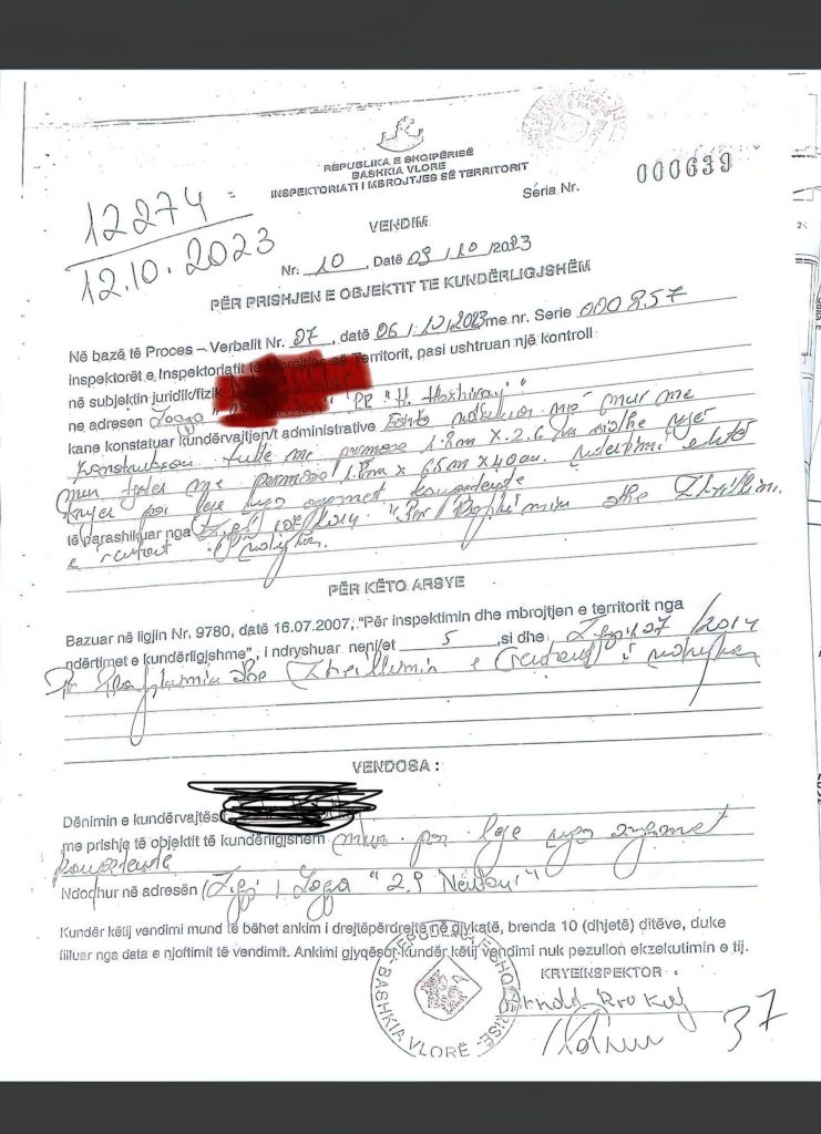 Së pari, zonja ka ndërtuar pa leje në vitin 2023 dhe, pas ankesave të mia si banor i pallatit, IMT Bashkia Vlorë ka nxjerrë vendime për prishjen e ndërtimit të paligjshëm.