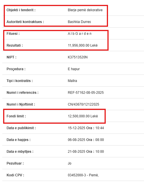 Një tjetër tender i Bashkisë Durrës po ngre pikëpyetje serioze mbi transparencën dhe përdorimin e fondeve publike. Bëhet fjalë për procedurën me objekt “Blerje pemë dekorative”, të zhvilluar nga Bashkia Durrës, e drejtuar nga Emiriana Sako.