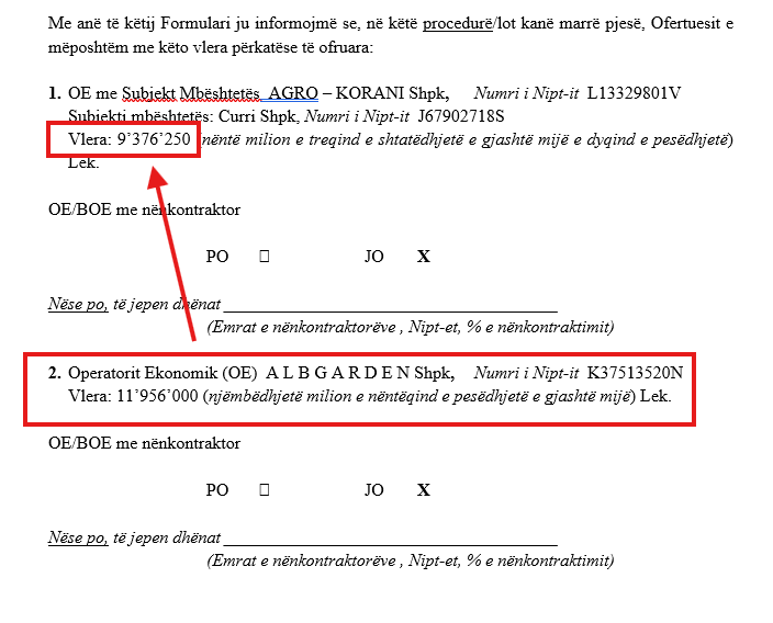 Sipas dokumentacionit të shqyrtuar nga JOQ Albania, në tender kanë marrë pjesë vetëm dy operatorë ekonomikë, çka përbën një konkurrencë të cunguar. Fitues është shpallur kompania “Alb Garden”, në pronësi të Pjetër Trashaj, me një ofertë prej 11,956,000 lekë të reja pa TVSH ose rreth 143 milionë lekë të vjetra me TVSH.