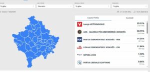 Lëvizja Vetëvendosje prin me 2.321 vota, e pas saj renditet Aleanca për Ardhmërinë e Kosovës me 1.815 vota.