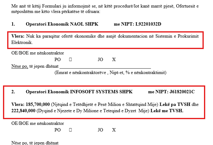 Procedura e ndjekur ishte zyrtarisht "e hapur", por në fakt ngjante më shumë me një dasmë ku vjen vetëm dhëndri. Nga kontrolli i dokumentacionit i kryer nga JOQ Albania, rezulton se në këtë teatër morën pjesë vetëm 2 kompani. Por, këtu fillon mrekullia: kompania e dytë erdhi sa për të mbajtur ison dhe për të plotësuar numrin, duke mos paraqitur asnjë ofertë ekonomike.